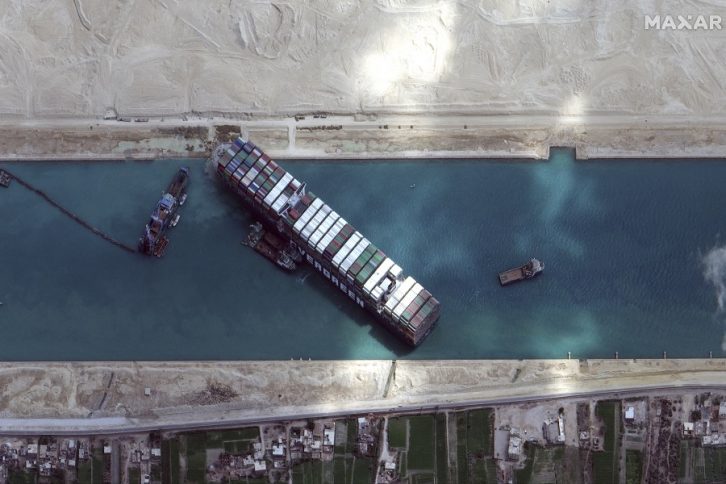 Στις 23 Μαρτίου, περί τις 07:40 τοπική ώρα, το πλοίο εμπορευματοκιβωτίων Ever Given, μήκους 400 μέτρων, προσάραξε λόγω ισχυρών ανέμων, με αποτέλεσμα να αποφράξει πλήρως τη διώρυγα του Σουέζ, καθώς στο σημείο εκείνο δεν υπήρχε διπλό κανάλι. 321 πλοία έμειναν εγκλωβισμένα στη Διώρυγα, ελπίζοντας ότι θα επιτευχθεί η διάνοιξη από τις αμέσως επόμενες ημέρες.